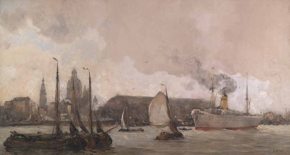 Het gesloten havenfront werd door Hobbe Smith fors neergezet doordat hij de lange overkapping midden in de voorstelling plaatste. Rechts vaart een schip van Stoomvaart Maatschappij Nederland, te herkennen aan de gele schoorsteen. Het zou de Prinses Juliana kunnen zijn, een schip dat in 1910, een jaar na de geboorte van de kroonprinses, van stapel liep in de Amsterdamse haven.