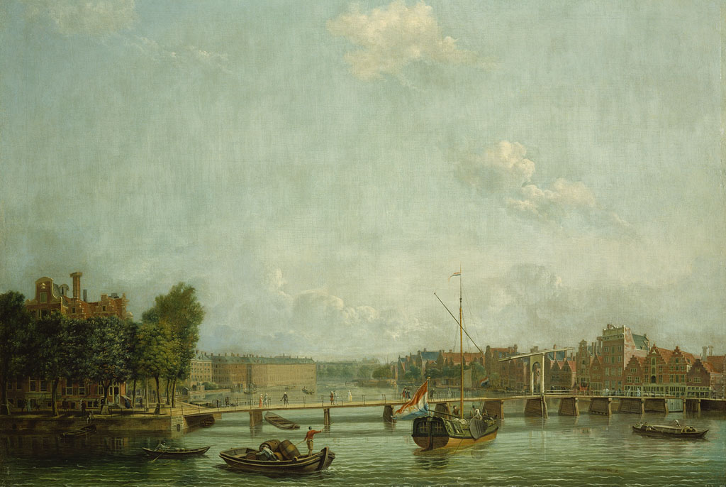 De Kloveniersburgwal, links, mondt uit in de Binnen-Amstel, rechts. Het schilderij wordt gedomineerd door de in 1626 gebouwde, 71 meter lange Halvemaansbrug (in 1862/63 door een nieuwe vervangen). Achter de brug ziet men links aan het water van de Amstel de brede gevel van het Diaconie Weeshuis. Dit gebouw werd afgebroken in 1888. ( Albert Blankert)
