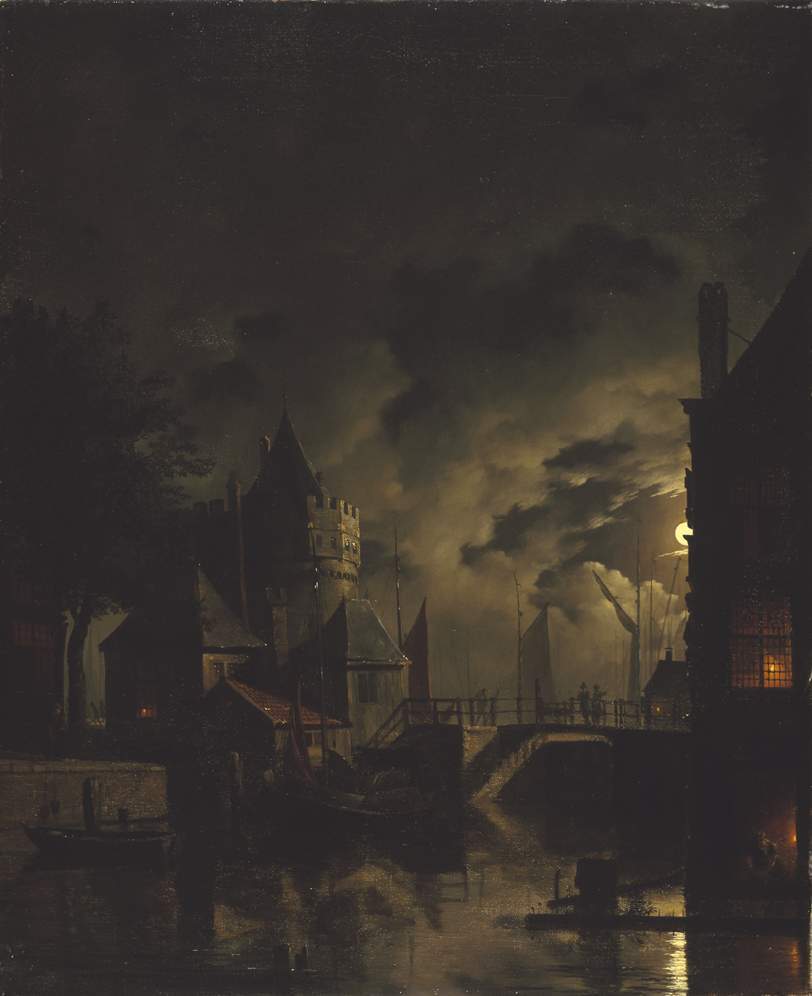 In Van der Hoops collectie bevonden zich naast kaars- of lamplichtscènes, ook enkele, minstens zo populaire ‘nocturnes’, nachtstukken bij maanlicht. Hendrik ten Cate had zich er in gespecialiseerd. Deze Schreierstoren werd voor Adriaan van der Hoop gekocht door Gerrit de Vries Jzn in 1841 voor 212. Ten Cates bekendste leerlingen waren Kaspar Karsen en Cornelis Springer. ( Norbert Middelkoop)