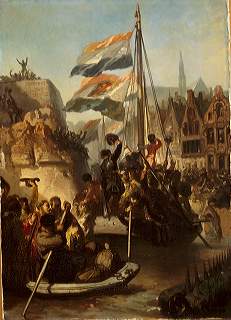 kwam nu met een vloot van platboomde schepen aanvaren en voorzag de benarde stad van voedsel. Onbeschrijflijk was de vreugde en iedereen dankte God voor dewonderbaarlijke redding. De prins beloonde de stad voor haar standvastigheid en gaf haar de keus tussen tijdelijke vrijdom van belasting en een hogeschool. Leiden koos voor de laatste en reeds 't volgende jaar liet Marnix van Sint-Aldegonde uit Duitsland de eerste hoogleraren overkomen.
