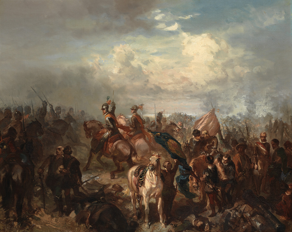 [...] Aan beide zijden werd op 2 juli met moed, onversaagdheid en volharding gestreden. Maurits en graaf Lodewijk voerden evenals Albert en Mendoza, de admiraal van Aragon, zelf hun troepen ten strijde en zij waren alom in 't heetst van 't gevecht. Pas tegen de avond leek het of de Staatsen terug moesten trekken. Toen Maurits hierop verse troepen deed aanrukken en een vernieuwde aanval der verzamelde ruiterij beval, dwong hij de vijand tot de terugtocht, welke op een chaotische vlucht uitliep. Zo behaalde Maurits een totale overwinning. Al het vijandelijke geschut, vijfhonderd gevangenen, onder wie Mendoza, en 105 vaandels vielen hem in handen. De voorzorgen die Maurits bij Nieuwpoort had genomen, getuigden van zijn militaire ervaring. Hij had zich zó opgesteld dat de vijand de brandende zon, stof en rook in 't gezicht had. [...] ( Dedalo G. Carasso)