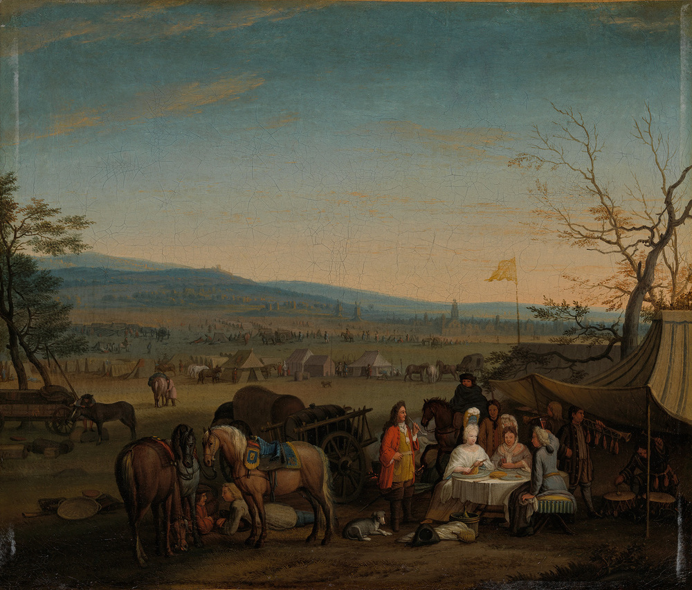 Aan een tafel voor een gedeeltelijk open tent zitten twee dames en een heer in 18de-eeuwse klederdracht. Om de tafel staan nog enige personen, waaronder een heer met Goudse pijp en openhangende rode jas. Links daarvan enige gezadelde paarden en karren. In het landschap, waarin blauwige heuvels op de achtergrond, staan tenten, paarden en kanonnen opgesteld.