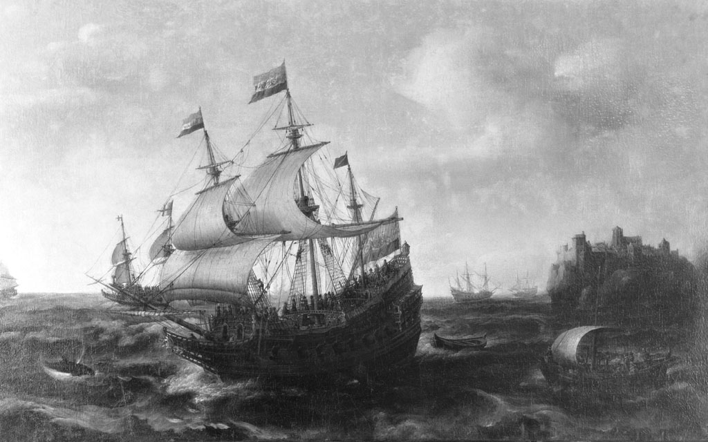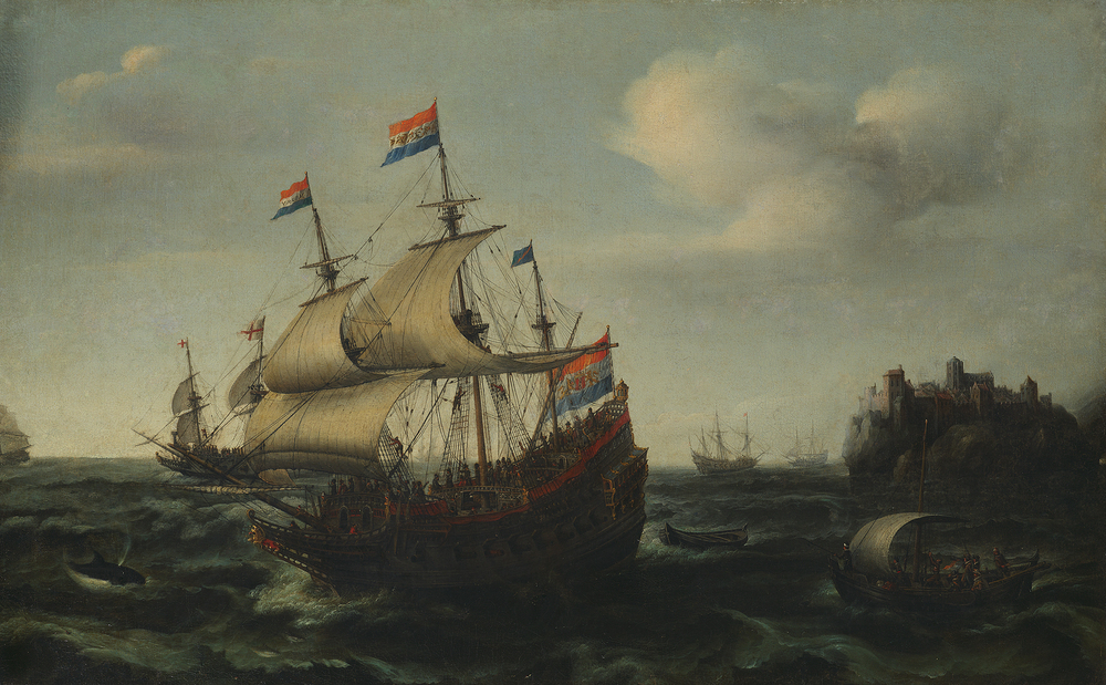 Tamelijk woelige zee met rechts, op vooruitstekende rotspunt een burcht. Op de voorgrond, als dominerend element, een driemaster, de statenvlag in de top, de vlag met het Amsterdamse wapen op de steven. Veel scheepsvolk op het dek. Links van het schil een bruinvis. Meer op de achtergrond nog een drietal zeilschepen; rechts een groot schip.