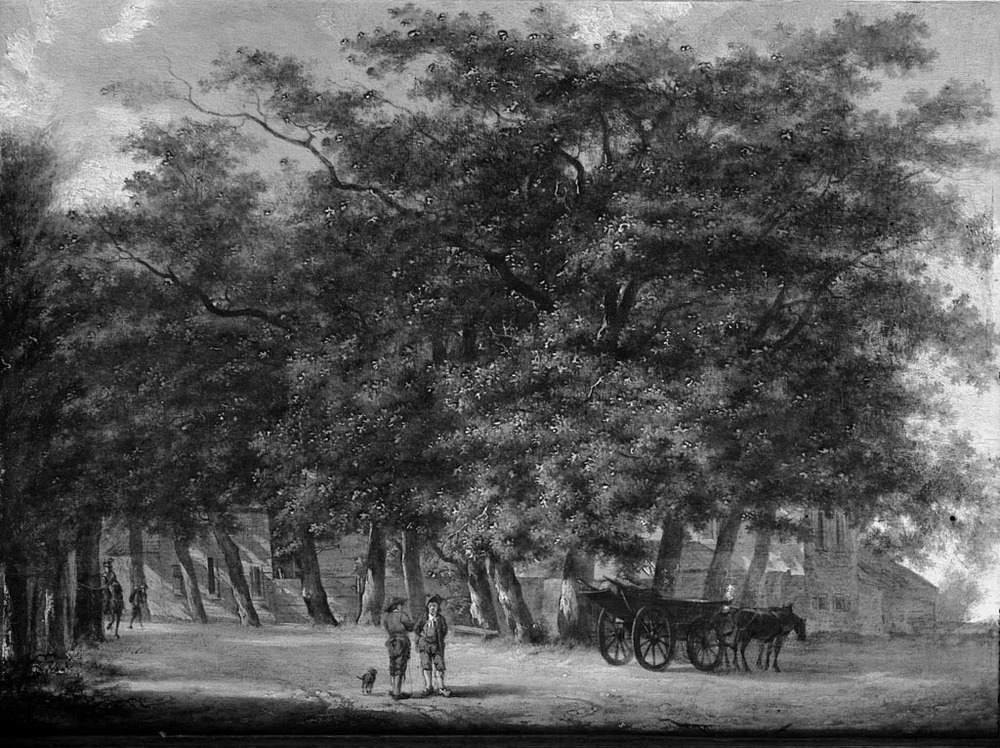 Opschrift op achterzijde: "Egbert van Drielst. Geb. te Groningen 1746, gest. te Amsterdam 1818". In de boomslag en de belichting toont het stuk zeer duidelijk de invloed van Meindert Hobbema. Deze meester werd door Van Drielst min of meer "herontdekt" en zeer bekwaam nagevolgd (zie: Niemeijer, op. cit., blz. 6 e.v.). ( Albert Blankert)