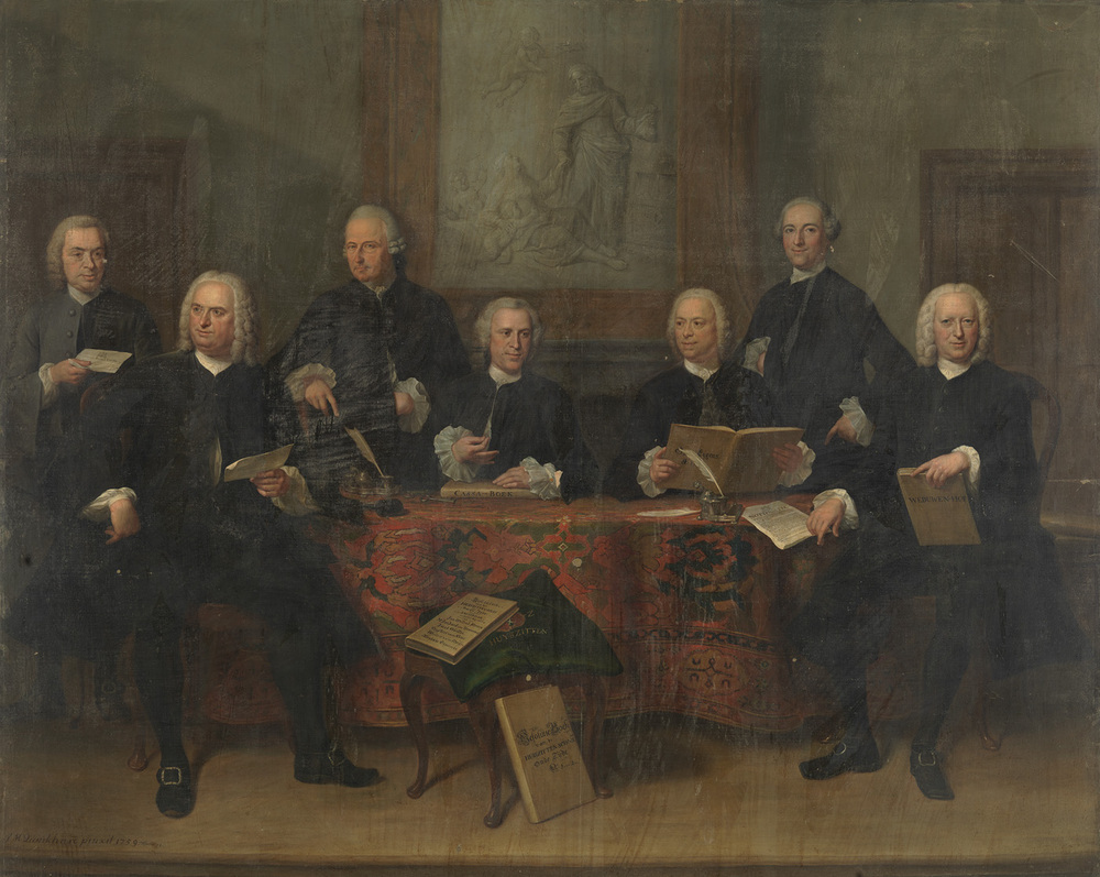 Het schilderij is één van de weinige regentenstukken waarvan omtrent de "planning" en het ontstaan uitvoerige informatie bewaard is gebleven. De betreffende passages in het notulenboek der regenten werden gepubliceerd door Oldewelt, wiens tekst en commentaar ik letterlijk overneem: "Dat in consideratie dit godshuis van tijd tot tijd is georneert met diverse schilderstukken houdende de portraitten van verscheidene der regenten in der tijd geschildert door treffelijke en zeer beroemde meesters en sulx tot geen geringe cieraat van het huis en teffens aangename memorie bij de posteriteit, het ook meermalen, maar wel bijzonder in den jare 1756, in overweeging was genomen bij de heeren Willinck, van Beaumont, Guillot en Van der Goot omme zich mede te doen portraitteren en wel ten hunnen privée kosten en dus het te formeeren stuk aan dit godshuis te vereeren. Maar dat daartegens in bedenking was gekomen dat in het jongste stuk (geschildert door der vermaarden Troost in den jare 1740) (d.w.z. ons cat.nr. 439) reeds waren de twee oudste der in 1756 regerende leeden, de heren van der Lip en Wiltens en er derhalven geen ander stuk dan maar van vier regenten voor als nog konde werden gemaakt, daar het nogtans voegsamer voorkwam dat een college twelk altoos uit ses leden geformeert werd zig ook in dat gewoon en volleedig getal laate verbeelden of schilderen, edog dat deze bedenking was opgeheven en weggenomen door overleg en voorneemen omme in de geprojecteerde schilderije plaats open te laten voor nog twee leeden door den tijd in te komen die verkiesen mogten zich mede daarinne te doen schilderen. Dat evenwel ook tegens dese precautie eene andere zwarigheyd, welkers sublevement niet minder noodsakelijk was, stont te orieeren door den tijd n.l. dat gelijk het verloop van veele jaren, bij faute van distincte denotatie, noodwendig gepaart gaat met de vergetelheid of onseekere gissing het alzoo ook zoude toegaan met de precise wetenschap wie geschildert waren in dit stuk om redenen dat sulx nopens aloude stukken niet anders te weeten is dan uit een vergelijking van het schilderjaar met de naamlijsten der regenten en juist dit de nakomelingschap zoude moeten brengen in een onsekere twijfeling vermits deselve de heren van der Lip en Wiltens wel zal vinden te zijn geweest regenten in 1758, maar des niet te min zig zoude vergissen indien daaruit wilde opmaken dat de beeldtenissen van die twee heeren in dit stuk zouden moeten werden gezogt. Dog is ook dit geprevenieert en vervangen door aan het uitvindingsvol zijnde penceel over te laten om te formeren een omslag van een boek en hetselve te plaatsen op een stoel met de superscriptie van de namen der regenten in dit stuk geschildert".