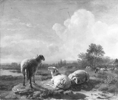 - Grazende en rustende schapen in een vlak landschap, 1770 - 1826