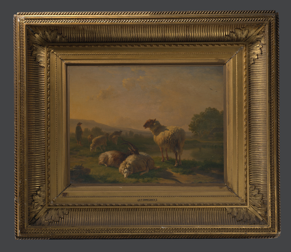 Aan de oever van een poel, herder met een aantal schapen. Liggend op de voorgrond, met zijn kop op de vacht van een ander dier, een geit. In de verte een flauw hellende heuvelrug. Rechts, omgeven door geboomte, een boerenwoning. Romantisch tafereel.- Trefwoorden