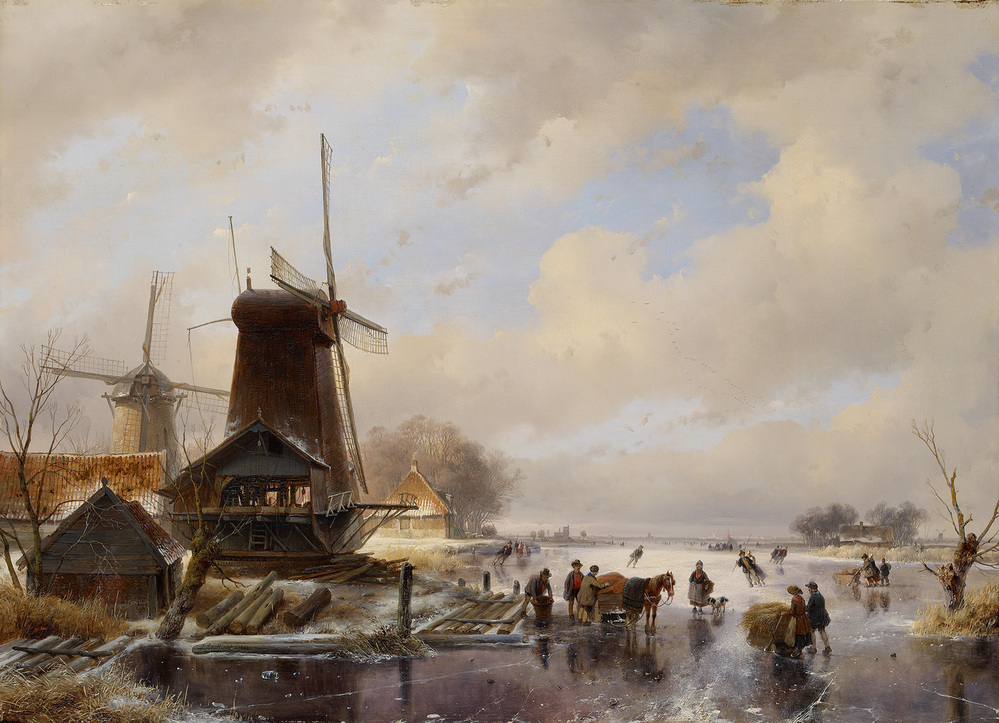 - Een houtzaagmolen aan een bevroren vaart, op de voorgrond zijn mannen bezig een ingespannen slede te laden, 1842
