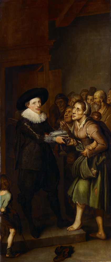 Om ‘alle misbruiken, in deze welgeschikte stadt voor te komen, en de zelve van bedelarye langs der straten geheel en al t’ontlasten’ werd in 1613 het Aalmoezeniershuis opgericht, gelegen aan het Singel. Dit was vooraleerst een plaats voor distributie van levensmiddelen, bedoeld voor behoeftigen die niet in aanmerking kwamen voor andere vormen van bedeling. In de galerij rond de binnenplaats vonden voedseluitdelingen plaats. Tevens werden weeskinderen die elders geen onderdak kregen en vondelingen hier opgenomen. In de hennepklopperij werden bedelaars te werk gesteld, die door de hoofdprovoost van straat waren gehaald. De organisatie was in handen van zes regenten of Aalmoezeniers. Een aantal van hen was, bij uitzondering, van katholieke huize. De werkzaamheden van de Aalmoezeniers staan centraal in een serie van vijf enigmatische schilderijen. De maker van de reeks, die opvalt door een vlotte en schetsmatige penseelstreek, is onbekend. Nadat lange tijd Van den Valckert als zodanig was genoemd, circuleren tegenwoordig twee naamloze kandidaten, de ene ‘beïnvloed door Van de Venne’, de andere uit de ‘omgeving van David Vinckboons’. Beide opties zijn aantrekkelijk, waarbij bij de laatste kan worden aangetekend dat van Vinckboons zelf geen gedateerd werk uit deze periode bekend is, alhoewel hij tot omstreeks 1632 in Amsterdam moet hebben gewerkt.