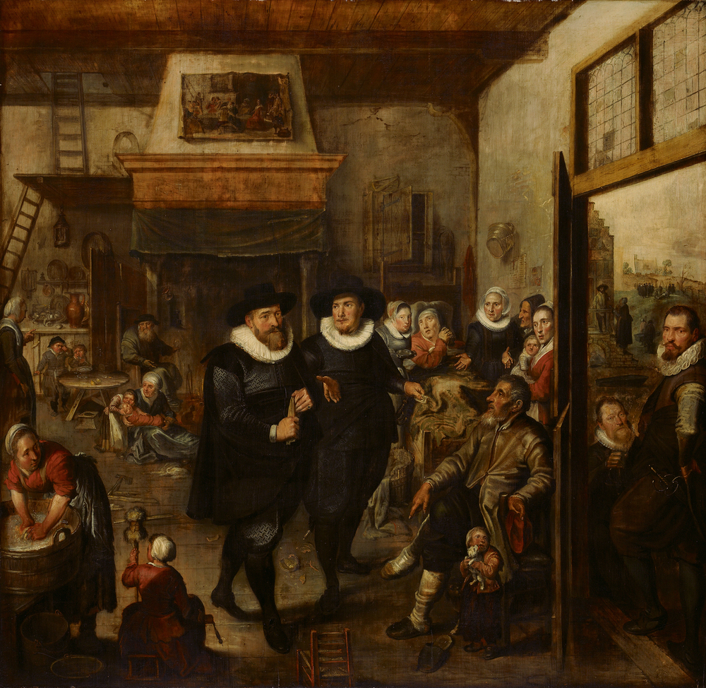 Dankzij het huisbezoek van deze twee Aalmoezeniers kunnen wij bij hoge uitzondering een blik werpen binnen de muren van een doorsnee gezin. De man rechts laat zien dat hij met zo'n voet echt niet kan werken. Zijn vrouw ligt ziek op bed. Als ze doodgaat, zullen de Aalmoezeniers voor een kist en een begrafenis zorgen - het tafereel boven in de deuropening verwijst daarnaar.