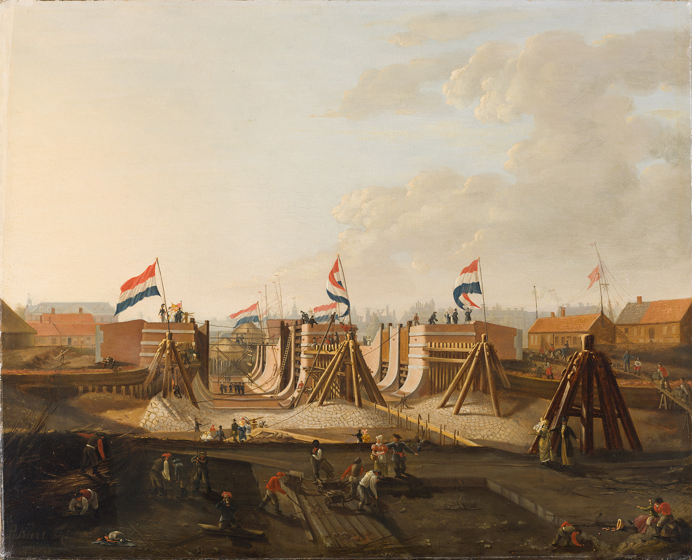 Petrus Kiers schilderde in 1831 de bouw van de Oosterdokssluis in Amsterdam. Een jaar daarvoor werd met de aanleg begonnen. Het Marine Dok maakte sinds de opening van het Oosterdok op 5 mei 1832 deel uit van het nieuwe havenbekken. De Oosterdokssluis bestond uit twee parallelle schutsluizen. ( Annemarie den Dekker)