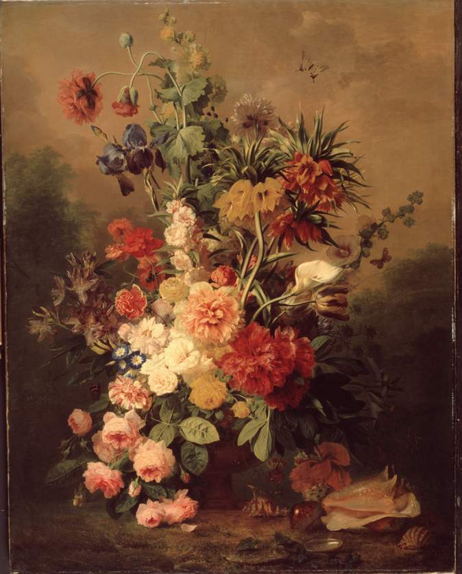 Het schilderij, dat in de 19de eeuw 'Eene rijke compositie van rozen en andere bloemen' werd genoemd, is een van de grootste bloemstukken die Van Os heeft vervaardigd. Op en naast het weelderige boeket beeldde hij drie vlinders af (een Atalanta op de Rosa Mundi, een Koningspage boven en een Argusvlinder rechts). In een terracotta vaas zijn de volgende bloemsoorten te herkennen: Van Huysumroos, goudsbloem, tuinaurikel, vlas (verdord), dopheide, koolroos, witte roos, rosa Mundi, dagschone, pioen, slaapbol, chinese roos, klaproos (gevuld), rhododendron, Turkse ranonkel (2 vormen), tuinbalsemien (gevuld), klaproos (half gevuld, 3 vormen), ridderspoor (gevuld), bleke lis, stokroos (gevuld), gele keizerskroon, keizerskroon, tuinaurikel, tulp ´Baguette´(2 vormen), witte aronskelk, Chinese aster, penstemon en klein afrikaantje. Op de bodem met tropische schelpen: Koolroos (bloemblad) en klimop (tak). ( Bert Vreeken)