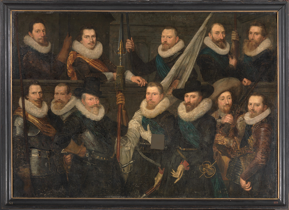 Midden boven gedateerd 1623. Is nu de tegenhanger van en vormde oorspronkelijk wellicht één geheel met cat.nr. 491 (zie aldaar eveneens voor de toeschrijving). De namen der voorgestelden kennen wij uit twee 17de eeuwse natekeningen. Het zijn, op de bovenste rij, v.l.n.r.: Jan Ysbrants Kieft, François de Neve, Philips Thysz. Schrijver, Jan Gerritsz Verwer, Jacob Jacobsz Vinck; op de benedenste rij: Jan Gerrits Meijn, Willem Symonsz, Adriaen Pietersz Raep (kapitein), Cornelis Ysbrantsz Kieft (vaandrig), Dirck Hasselaar "sergeant" volgens m.s. Egerton, "luitenant" volgens tekening Beudeker, Jan Jacobs in 't Hart, Adriaen Bremer (zie: 1. COLIJN; fol. 17 (schets) en 16 (namen en wapens) van Brits Museum, ms Egerton, nr. 983; zie SIX 1903. 2. Gemeentearchief, atlas Christoffel Beudeker, Oudheden van Amstelredamme, schets nr. 7, zie Six 1887, blz. 4 en Six 1897). Schaep noemde in 1653 per abuis Jacob Gerritsz. Hoinck als kapitein (zie onder cat.nr. 491). Het stuk bleek in de vorige eeuw na een schoonmaak zeer gehavend; een reeks koppen werd toen gereconstrueerd door prof. B. Wijnveld (Six 1887, blz. 5). ( Albert Blankert)