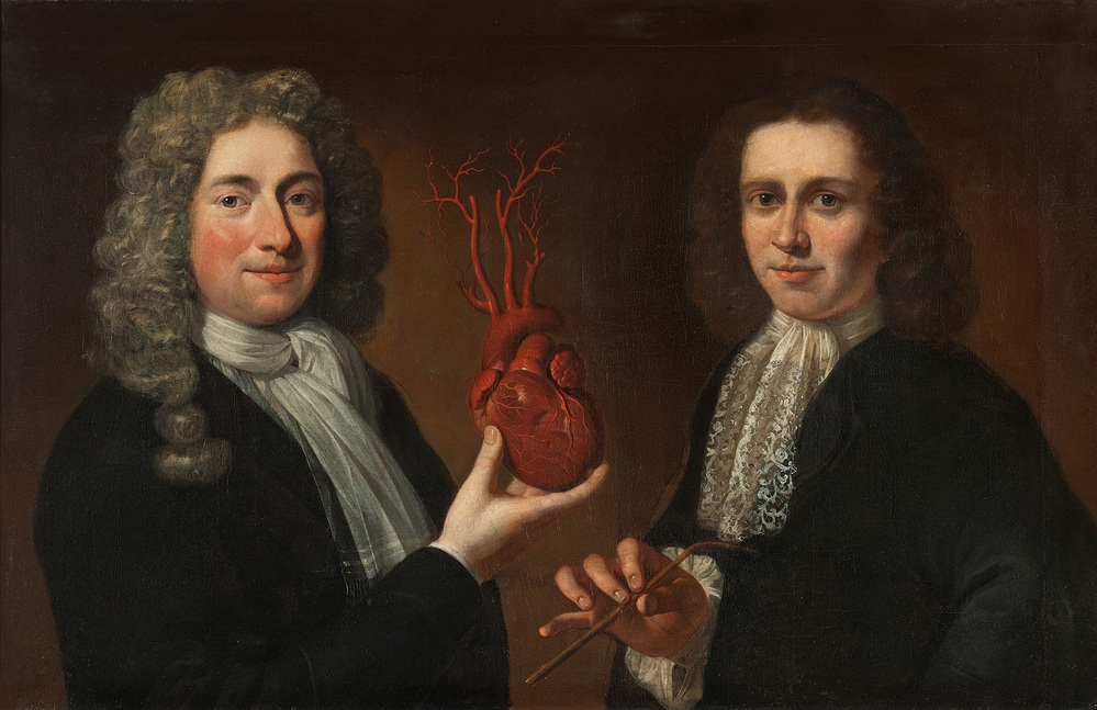 Twee gepruikte heren tot het middel afgebeeld. De linker houdt een opgespoten hart in de hand, de rechter een medisch instrument.