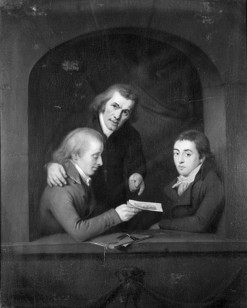 Drie kunstliefhebbers en/of graveurs blijkens de costuums uit het eind van de 18de eeuw die zich samen hebben laten portretteren.