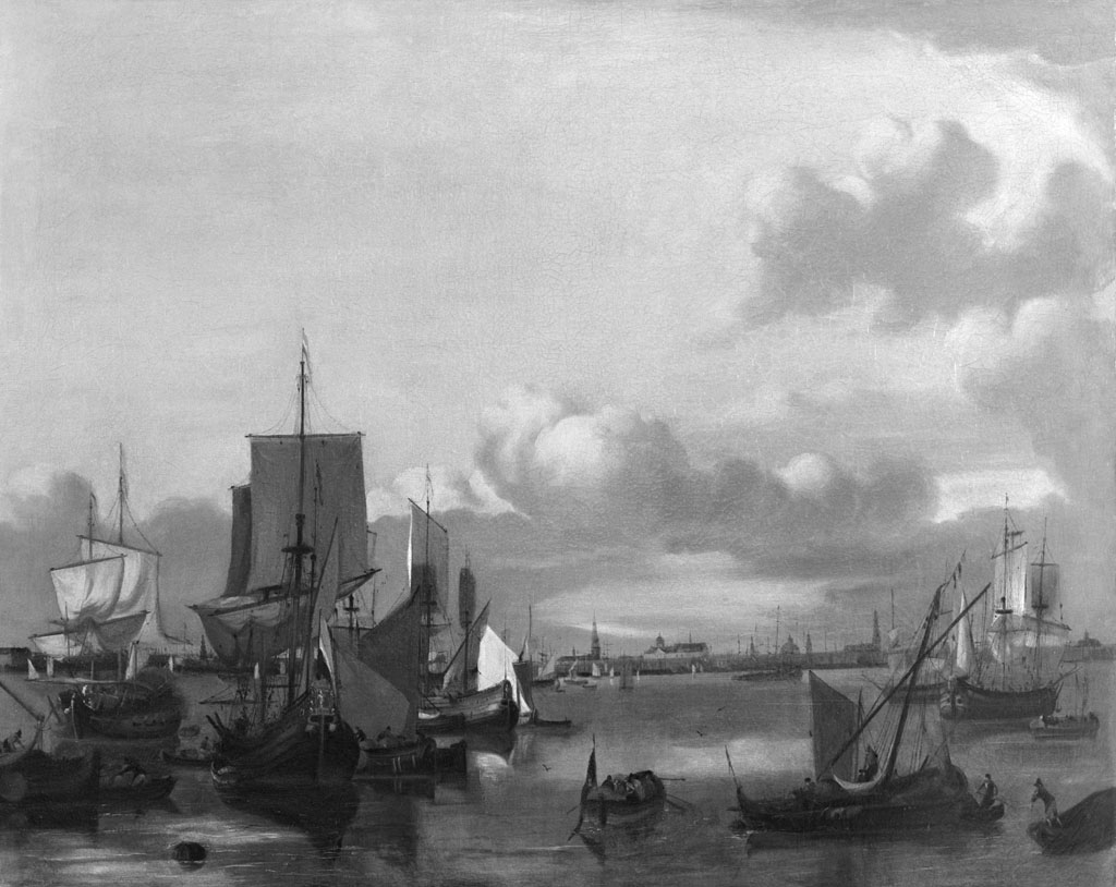 In de achtergrond het stadsprofiel van Amsterdam. Het schilderij heette tot dusver op grond van het monogram een werk van L. Backhuyzen. Het past echter in het geheel niet in diens oeuvre, al was het alleen maar omdat op diens talloze marines nooit de hier in beeld gebrachte absolute windstilte heerst, waarbij alle wimpels en zeilen slap neerhangen. Daarmee is het slechts verwant met één ander, eveneens op grond van een monogram aan Backhuyzen toegeschreven schilderij, dat echter veel helderder van sfeer is (pariculiere verzameling; cat.tent. Zee- Rivier- en Oevergezichten, Dordrecht 1964, cat.nr. 10, afb. 109).