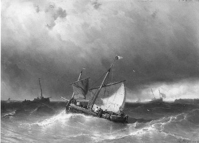 - Woelige zee, op de voorgrond een vissersschip, 1858