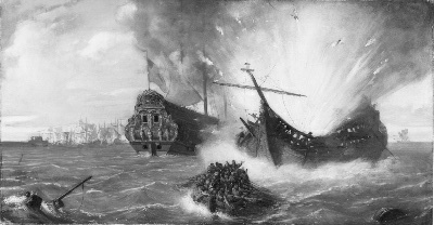 [In 1677 werd een geheime expeditie onder commandeur Binckes naar West-Indië gestuurd om daar de Fransen te bestoken.] Na menig gelukkig wapenfeit bouwde Binckes aan de Klipbaai op het eiland Tobago een schans. Daar brak op 21 februari 1677 een zeeslag met een Frans eskader onder graaf d' Estrées uit die in afgrijselijkheid alle andere overtrof. Bijna vierentwintig schepen gingen in de door klippen en riffen onbevaarbare baai verloren in een zee van vuur. Kapitein Roemer Vlacq voert het bevel over 't Huis te Kruijningen. Als hij door het admiraalsschip van d' Estrées met een viermaal zo sterke bemanning wordt aangevallen, vlucht een deel van het volk van Vlacq aan land. Toch geeft hij 't niet op, maar kapt het anker om samen met zijn vijand te stranden en te vergaan. D'Estrées ontsnapt aan dit gevaar en opent een verschrikkelijk vuur op Vlacq, wiens schip aan de grond is geraakt. D' Estrées entert met alle macht het schip van Vlacq. Deze laat een vaatje buskruit naar boven brengen en ontsteekt dit. De kruitkamer vat vuur en het schip barst met vriend en vijand uit elkaar. Door een onverklaarbaar toeval bleef de wakkere kapitein in leven. ( Dedalo G. Carasso)