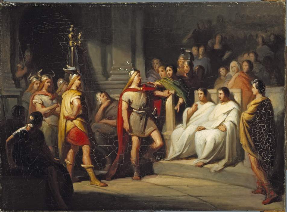 De Friezen hadden met de Romeinse landvoogd Paulinus een geschil over het eigendom van bepaalde gronden. Om de kwestie te beslechten werden enkele Friese gezanten naar keizer Nero in Rome gezonden. Toen zij daar een schouwspel bezochten, vroegen de Friezen waar de senatoren en leden van de ridderstand zaten. Zij vroegen waarom er zich verschillende mensen tussen bevonden die niet tot de Romeinen behoorden. Het antwoord luidde 'dat dit de gezanten der trouwste en dapperste bondgenooten van Rome waren. De gezanten namen toen tussen de senatoren plaats en zeiden 'dat de Friezen minstens even dapper en trouw waren als welk ander volk ter wereld ook'. Zij werden luid door alle aanwezigen toegejuichd. Het doel van hun zending mislukte echter, en de betwiste gronden werden aan de landvoogd toegewezen.
