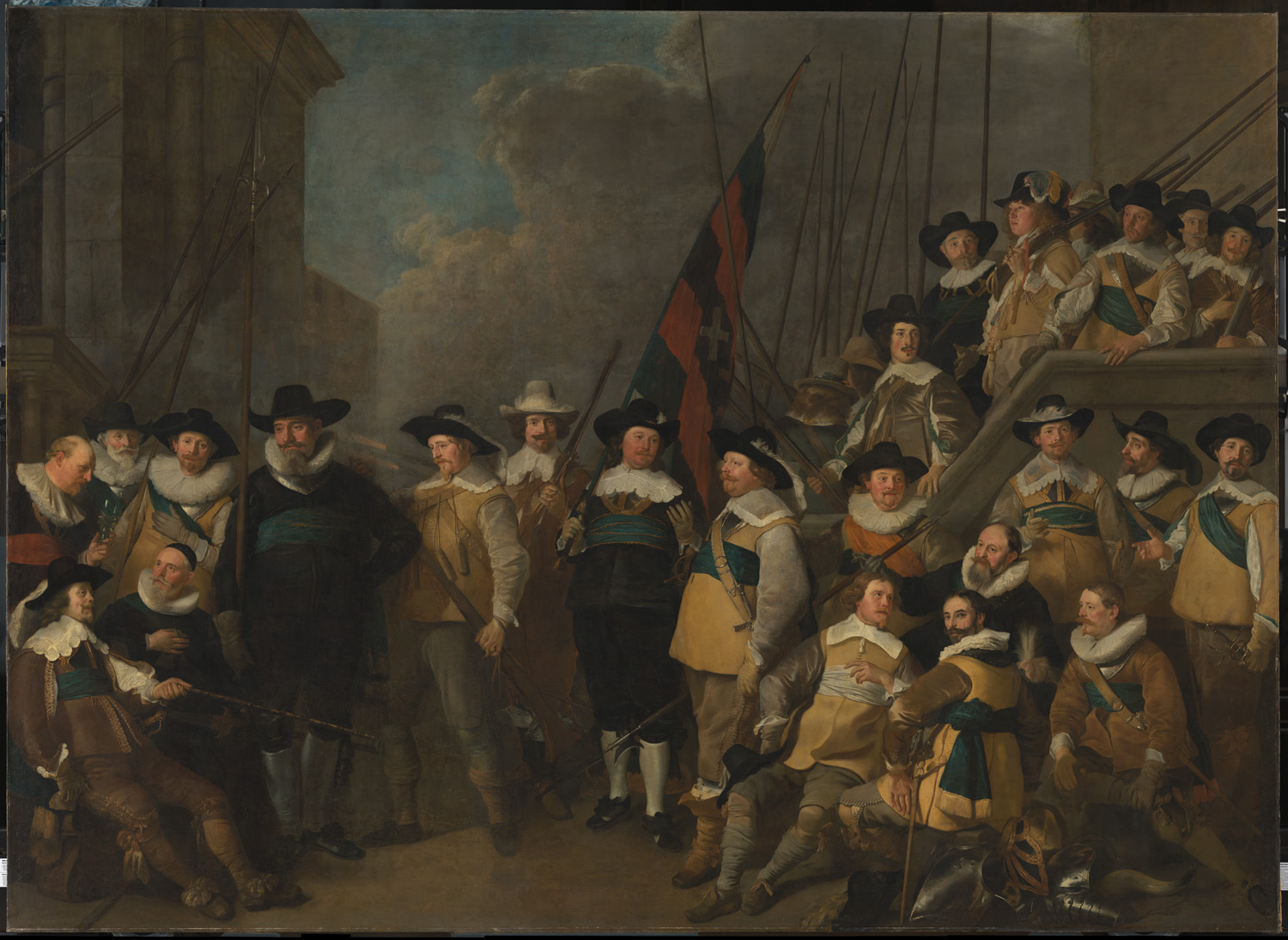 Schuttersstuk met de officieren en manschappen van de Compagnie Kloveniers van kapitein Cornelis de Graeff en luitenant Hendrick Lauwrensz, Amsterdam, 1642. Groepsportret van de schutters van de Kloveniersdoelen.