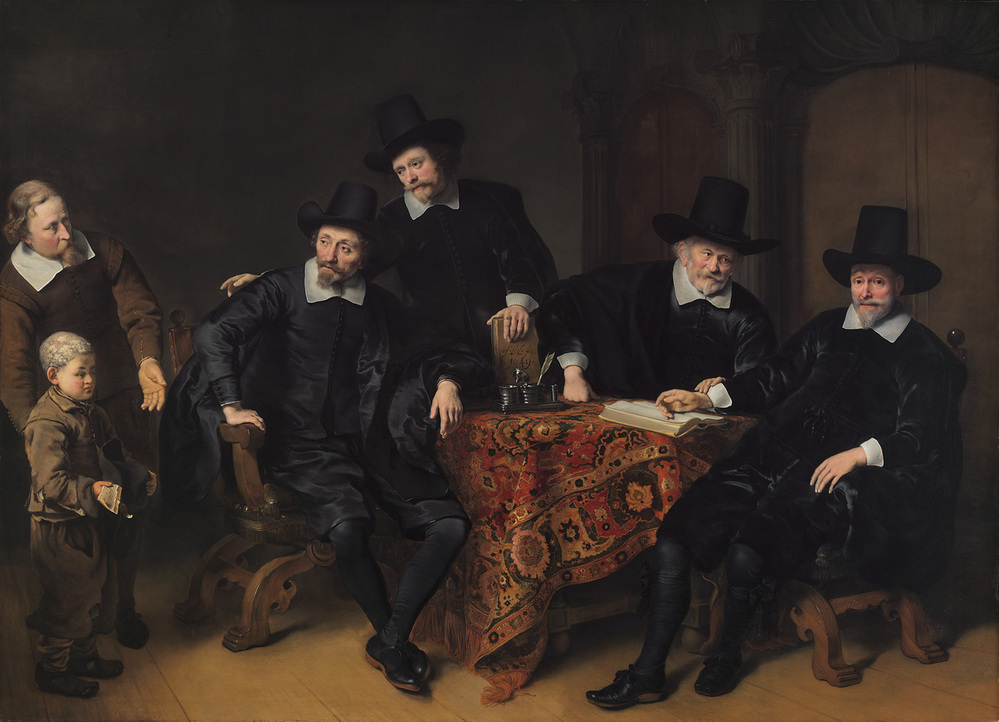 het jongetje dat hier voor de regenten wordt binnengeleid heeft een schimmelinfectie van de hoofdhuid, die vroeger veel voorkwam en die favus of kletskop wordt genoemd. Zijn aandoening bevestigt dat ook andere aandoeningen voor behandeling in het Leprozenhuis in aanmerking kwamen. In zijn hand houdt hij een zogeheten ‘vuylbrief’, een officieel document dat hem het recht op toegang tot het Leprozenhuis gaf. De regenten die in vergadering rond de tafel zitten zijn van rechts naar links: Jacob Willem Hooft (1586- 1685), Augustijn Wtenbogaert (1577- 1655), Pieter Cleutrijn (1585/’90- na 1651) en Joan van Hartoghvelt (1602- 1669). Het binnengeleide jongetje heeft als functie de regenten heel expliciet als weldoeners af te beelden. Dit gebeurde eerder op portretten van het Burgerweeshuis. Het Leprozenhuis was geen instelling die gericht was op kinderen. Bol had blijkbaar bedacht dat een behoeftig kind meer medelijden dan een volwassene inboezemde. Zo beeldde hij de regenten niet alleen af als goed bestuurders, maar ook als barmhartige mensen. ( Tom van der Molen)