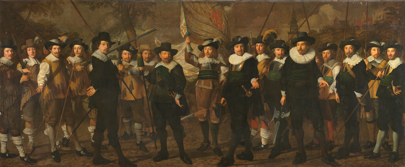 De schutters staan aan het begin van de Oudezijds voorburgwal, waarvan men rechts de huizen en op de achtergrond een brug ziet. Rechts boven de huizen de Oudekerkstoren. Schutters en gebouwen behoren tot wijk IX, in welke wijk ook de schilder Claes Eliasz woonde (Meyer 1885; Six 1886).