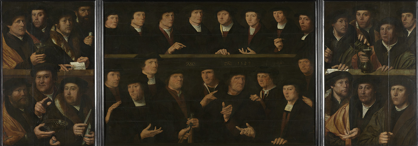 Een groep schutters van de Kloveniersdoelen. Schuttersstuk bestaande uit drie delen: een middenstuk uit 1529 met zeventien personen en twee zijstukken elk met zeven portretten die later zijn toegevoegd. Alle figuren zijn in buste of ten halven lijve voorgesteld, met een zwarte baret op het hoofd en meestal met gebarende handen. Op het linkerzijstuk een man met een lied op een stuk papier, een man met een roemer en een schutter met een haring en een mes. In het middenstuk houden twee schutters in hun hand de loop van hun geweer, boven een man met een pen. In het rechterstuk ook een schrijvende man met een pen naast de man met een tinnen kan.