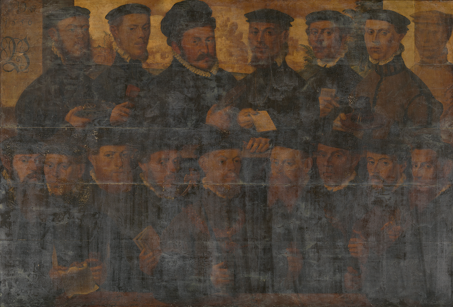 Een der schutters links onder houdt een blad muziek in de hand met daarop de woorden: "die Man / dat Wijf" (facsimile in cat. Rijksmuseum 1912; n.b. het handschrift van Schaep uit 1653 vermeldt in de Handboogdoelen onder nr. 4 een nu verdwenen schuttersstuk van het jaar 1558 "waerin een met een blad musijck, daerin deze woorden: Een Man, Een Wijff, op musijcknoten"). Ons schilderij wordt door Schaep genoemd in de Kloveniersdoelen "op de camer genaempt het Heertgen (...) 23. Ibidem noch een oud stuck, get. B anno 1556" (SCHELTEMA VII, 1885, blz. 138). De man links boven heeft een schaal in de hand met daarop de letter B. Het schilderij is zo gesleten dat de teksten die op andere briefjes in de handen der schutters gestaan moeten hebben, niet meer te lezen ziin. De kop rechts boven is slechts gedoodverfd. Six was van mening dat De Jongh in zijn Van Mander editie het portret van Dirck Jacobsz naar deze kop heeft laten graveren ("Het leven der .. schilders .. door Karel van Mander .. overgebragt door Jacobus de Jongh" I, Amsterdam 1764, plaat F 3), hetgeen er op zou duiden dat men dit schilderij in de achttiende eeuw reeds aan D. Jacobsz toeschreef. Scheltema (1864, 1879) nam het op als een werk van Jacob Cornelisz, waarna Six het in 1895 weer op naam van Dirck Jacobsz bracht. L. Münz, die de noten voor de tweede editie van Riegls "Das Holländische Gruppenporträt" verzorgde, meende dat het van dezelfde anonieme hand was als schuttersstukken van 1554 (cat.nr. 605), 1557 en 1559 (cat.nr. 606). De Vries (1934) beschouwde ons stuk van 1556 samen met die van 1557 (cat.nr. 112) en 1559 (cat.nr. 606) als een groep, waarvan hij vermoedde dat zij in het atelier van Dirck Jacobsz ontstaan was. Hoogewerff verbond het slechts met het schilderij van 1559 en meende dat deze twee panelen misschien door Allaert Claesz geschilderd waren. Philippot nam Münz' idee over, en doopte de anonieme schilder de "Meester van het Antwerpse Familieportret", naar het 1559 gedateerde familieportret in het Museum voor Schone Kunsten te Antwerpen. ( Rob Ruurs)