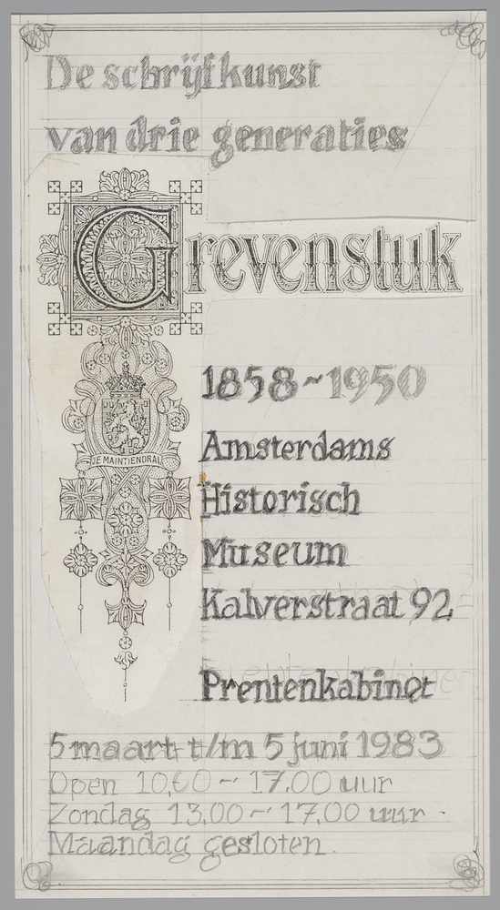 - 1983, ontwerp voor affiche tentoonstelling De schrijfkunst van drie generaties Grevenstuk 1858 - 1950, 1983