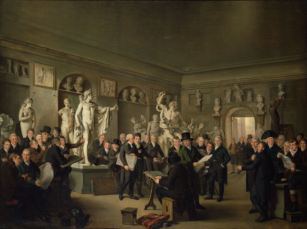 Tussen 1806 en 1808 schilderde De Lelie zijn laatste groepsportret voor Felix Meritis, bedoeld als tegenhanger van De Tekenzaal. In de beeldengalerij staan afgietsels van beroemde klassieke beelden, zoals de Apollo Belvedere (in het midden links) en de Laocoön (in het midden rechts). De afgebeelde personen zijn vooraanstaande Felix Meritis-leden. De schilder zelf is in het midden, zittend met de rug naar de kijker toe afgebeeld. De Apollo Belvedere staat precies in dezelfde houding als het naaktmodel op De Lelie's Inwijding van De Tekenzaal uit 1792.