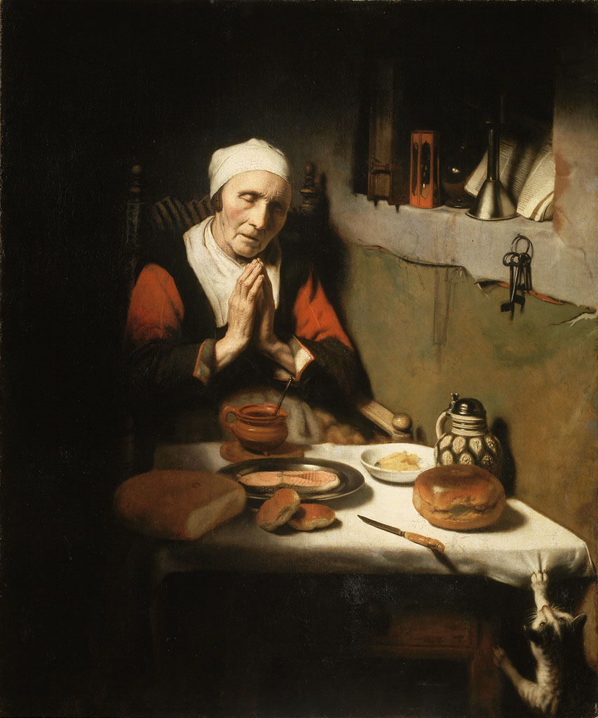 Voorstelling bekend onder de titel 'Het gebed zonder end'. Een met gevouwen handen biddende oude vrouw, zittend aan een gedekte tafel met brood, kaas, een kruik, een kom en een bord met vis. Rechts trekt een kat aan het tafelkleed. Rechts een nis in de muur met sleutels, een trechter en een zandloper
