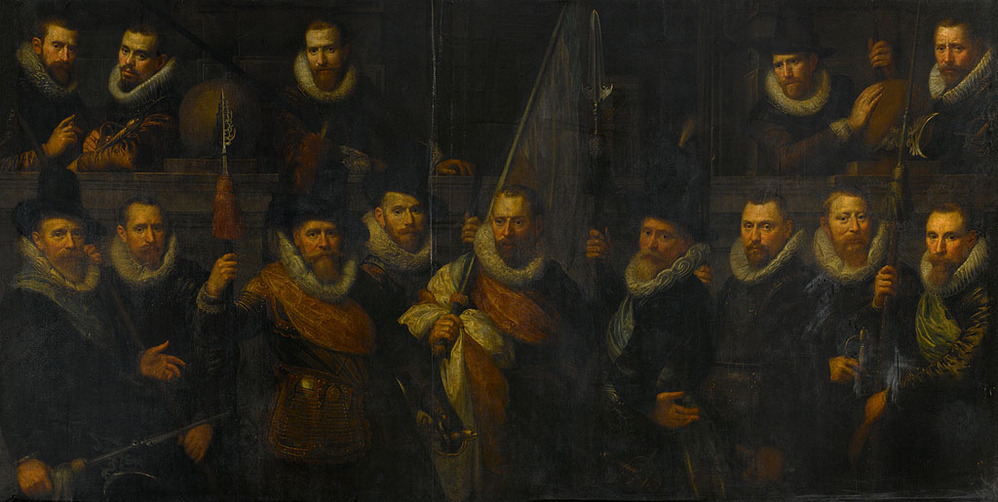 Schuttersstuk van de Kloveniersdoelen met veertien figuren in twee rijen, de bovenste achter een balustrade. Beneden in het midden de vaandrig, andere schutters met hellebaarden