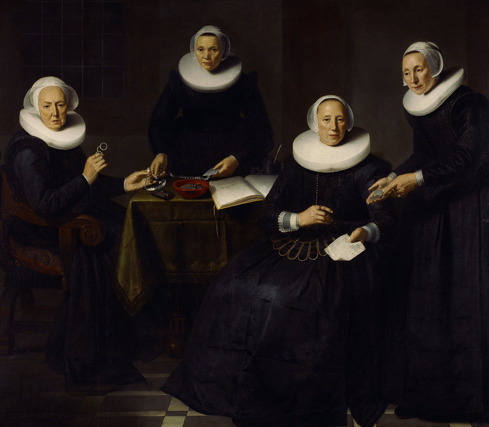 De dame geheel links is waarschijnlijk Lysbeth Hendricksdr Haeck. Zij was regentes van het Spinhuis van 1599 tot aan haar dood in 1638, het jaar waarin het portret is gemaakt. De andere zittende dame is Styntje Thomas, regentes van 1625 tot 1645. ( Norbert Middelkoop)