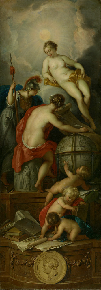 Jacob de Wit was de belangrijkste Amsterdamse decoratieschilder van zijn tijd. Hij vervaardigde wand- en plafondschilderingen in vele grachtenhuizen. In zijn laatste levensjaar schilderde hij deze allegorische voorstelling voor het huis van Isaac de Pinto aan de Nieuwe Herengracht. Oorspronkelijk was het geplaatst in de bibliotheek, tussen twee deuren.