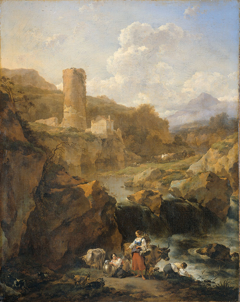 Italiaans landschap met een vervallen toren. Op de voorgrond wassen herderinnen in het water
