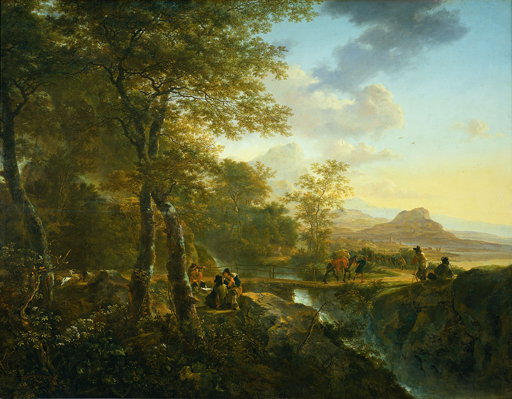 Italiaans landschap met tekenaar. Een weg door het landschap met een brug over een bergstroom. Op de weg een man met een muilezel. Op de voorgrond enige zittende figuren