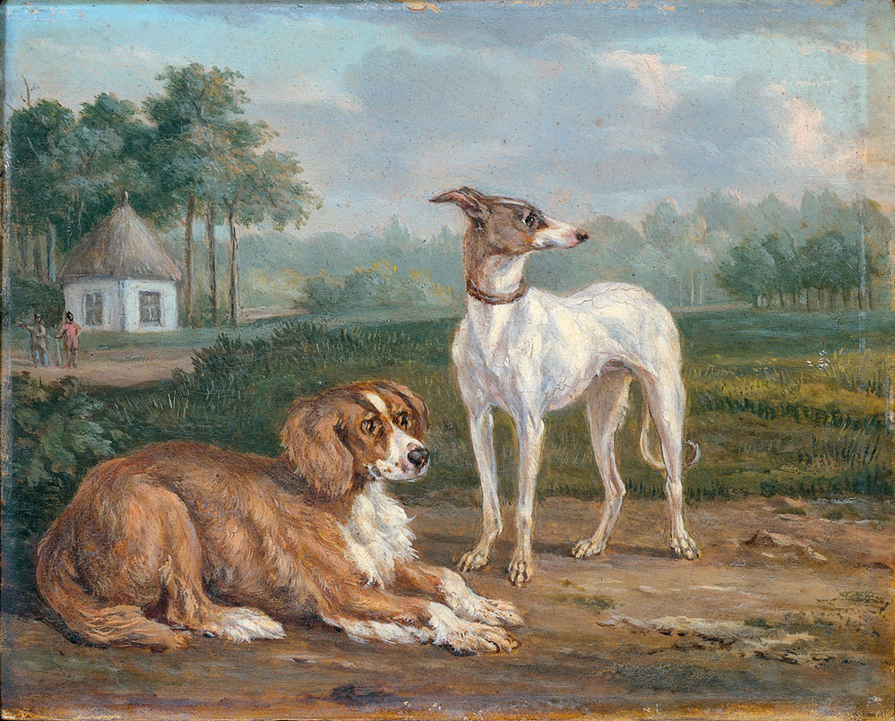 Enkele schilderijen van dieren in de verzameling van Adriaan van der Hoop verwijzen naar het buitenleven van de bankier. Deze schilderijen kregen van de eigenaar een plaats op zijn landgoed Spaarnberg. Van dit kleine paneel met een patrijshond en een windhond door Jan Dasveldt is onbekend of de verzamelaar er opdracht voor heeft gegeven en evenmin of het om zijn eigen honden gaat. ( Norbert Middelkoop)