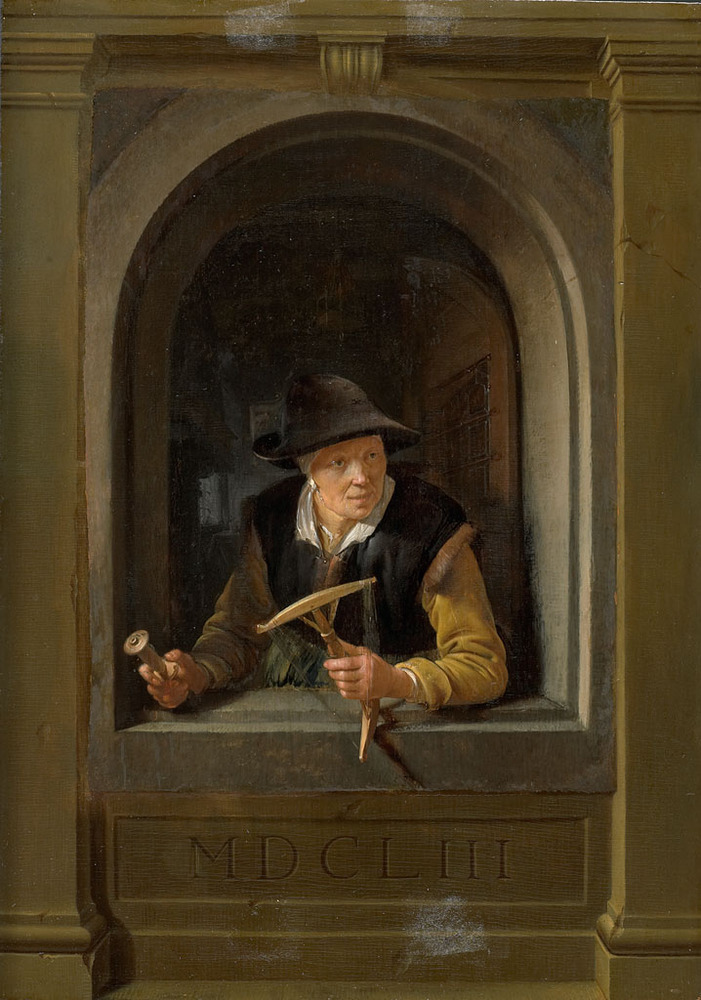 Een vissersvrouw, geleund uit een venster met een haspel in één hand en een klos garen in de ander