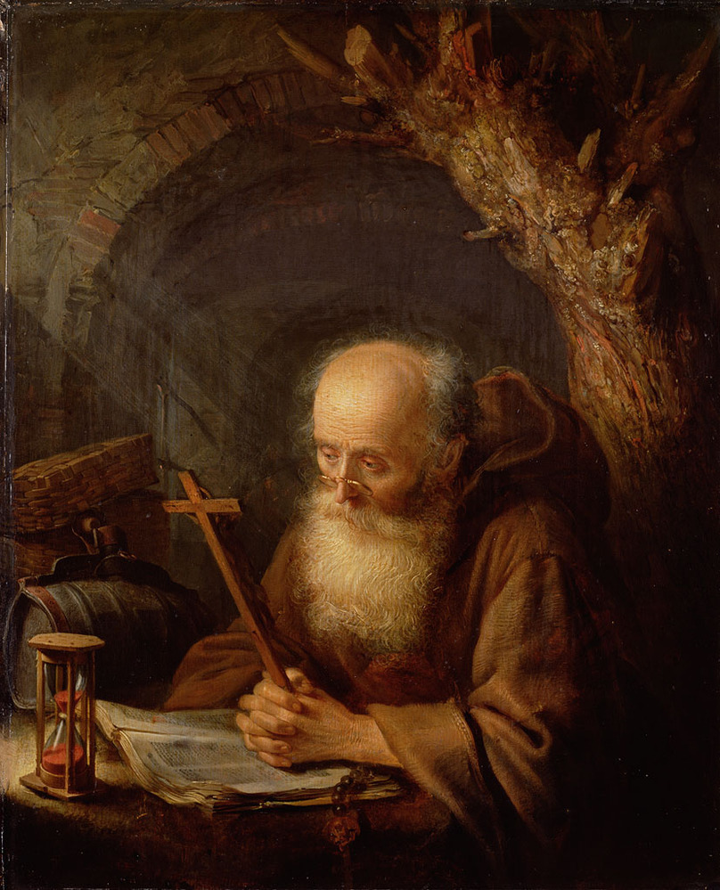 Een kluizenaar. Oude man met een bril mediterend met een kruisbeeld. Op een tafel liggen een opengeslagen boek, rozenkrans en zandloper