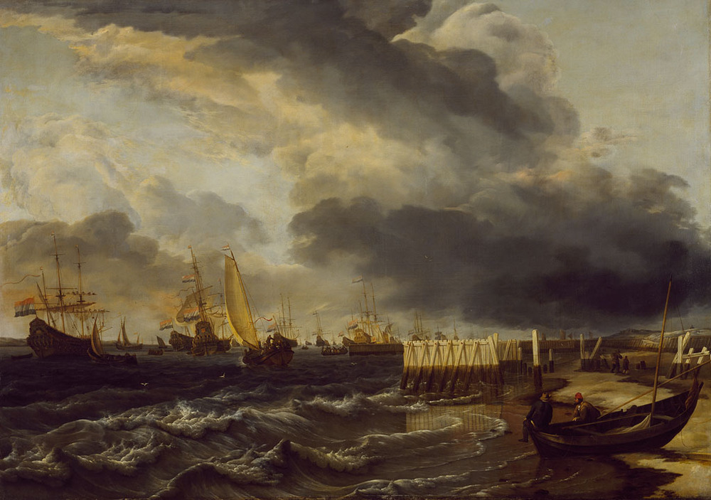 Een vloot bevindt zich tussen de kust van Den Helder (rechts) en het eiland Texel (links). Vanaf de rede van Texel vertrokken de handelsschepen naar oost en west. De rede van Den Helder was de ankerplaats voor oorlogsschepen van de Amsterdamse en Westfriese Admiraliteiten. Het schip in het midden is ooit herkend ald de 'Staveren'. Dit schip maakte aan het begin van de Tweede Engelse Oorlog (1665 -1667) deel uit van de vloot die op 13 juni 1665 werd verslagen door de Engelsen in de Slag bij Lowestoft. Het is echter onwaarschijnlijk dat deze vloot is afgebeeld. De schepen zijn niet op weg naar de volle zee maar keren juist terug naar de thuishaven.