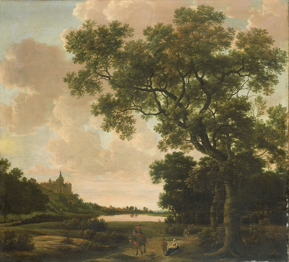 Landschap met een gezicht vanuit een bos op de Zwanenburcht te Kleef. Op de voorgrond een man op een muilezel en verschillende figuren op een weg