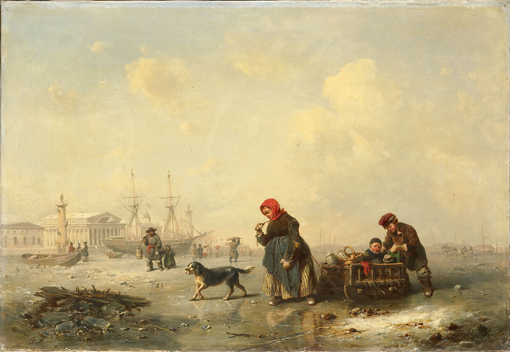 Adriaan van der Hoop kocht dit werk, ‘Een Wintergezigt op de Newa’, in december 1847. Op de voorgrond trekken een vader en moeder de slee met hun kind over het ijs. Aan de oever is links de neoclassicistische Beurs te zien, gebouwd naar ontwerp van Thomas de Thomon in 1805-’10. Zelf is van der Hoop nooit in Rusland geweest. De contacten van Hope & Co verliepen via het bankiershuis Stieglitz in St. Petersburg. ( Norbert Middelkoop)