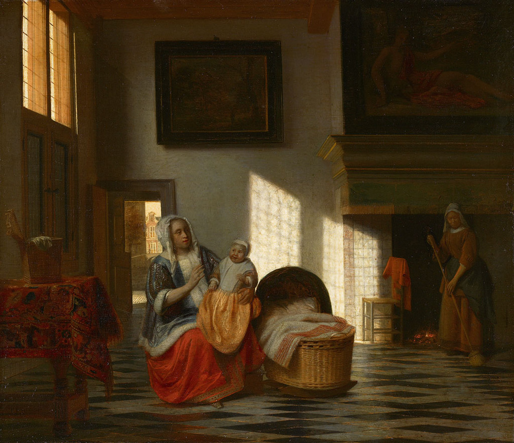Een moeder, zittend in het midden van een vertrek, met kind op schoot bij een wieg; een dienstmeisje veegt de stenen vloer.