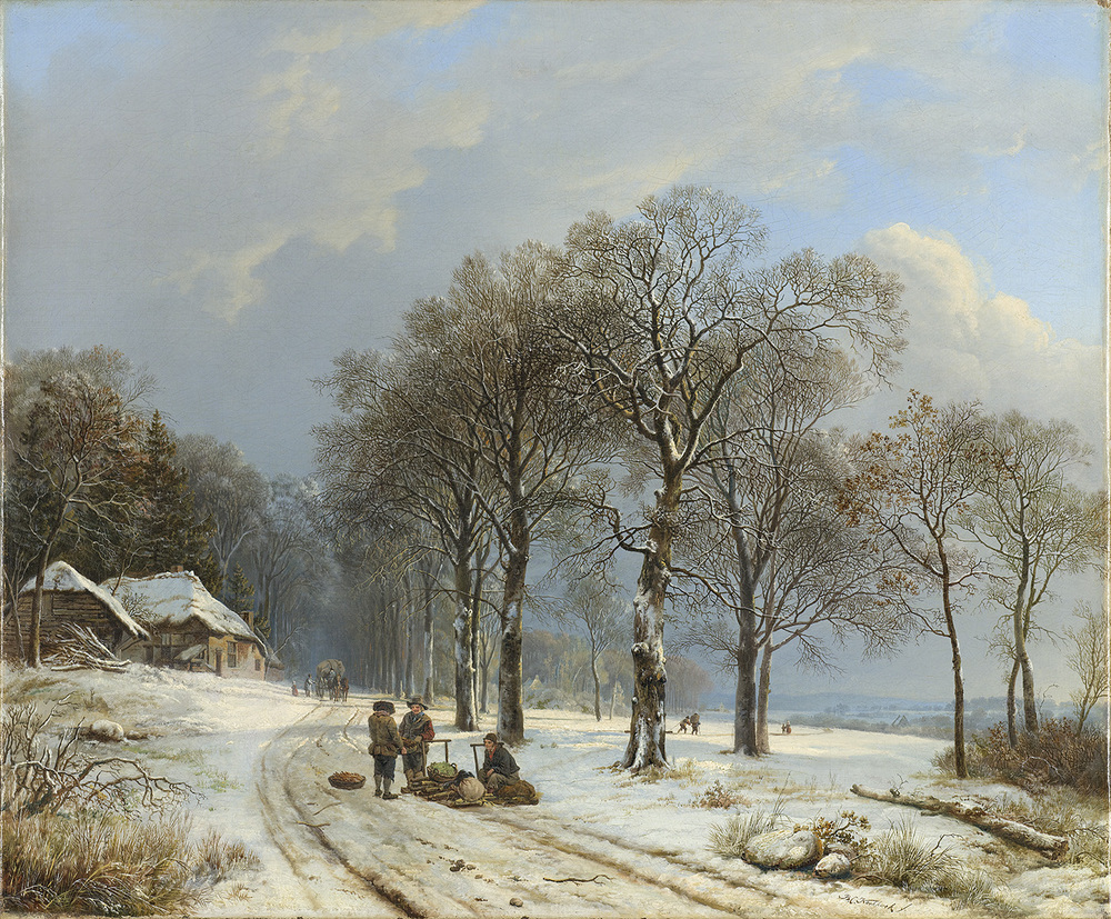 "; veiling, Charles Howard Hodges (1764-1837), Amsterdam (J. de Vries et al.), 27 febr. 1838 e.v. (28), nr. 344 ("Een aangename Landweg, met fraai geboomte beplant, terzijde een boeren woning, en door het geboomte een aangenaam verschiet, voorgesteld bij winter met sneeuw, gestoffeerd met beeldjes bij een ijsslede, een boeren wagen met paarden en verdere figuren; [...] hoog en breed als de voorgaande [6 p. 2 d., breed 7 p. 5. d. [62 x 50 cm] Doek]'], fl 375 aan de kunsthandelaar Albertus Brondgeest voor Adriaan van der Hoop [expl. RKD; Lijst, p. 21, nr. 171]; nagelaten aan de Stad Amsterdam, 1854, in vruchtgebruik bij zijn weduwe Dieuwke Fontein (1800-1879) [Taxatie, p. 5, nr. 171, fl 250]; Museum Van der Hoop, 1880-1885; in bruikleen aan het Rijksmuseum, 1885.