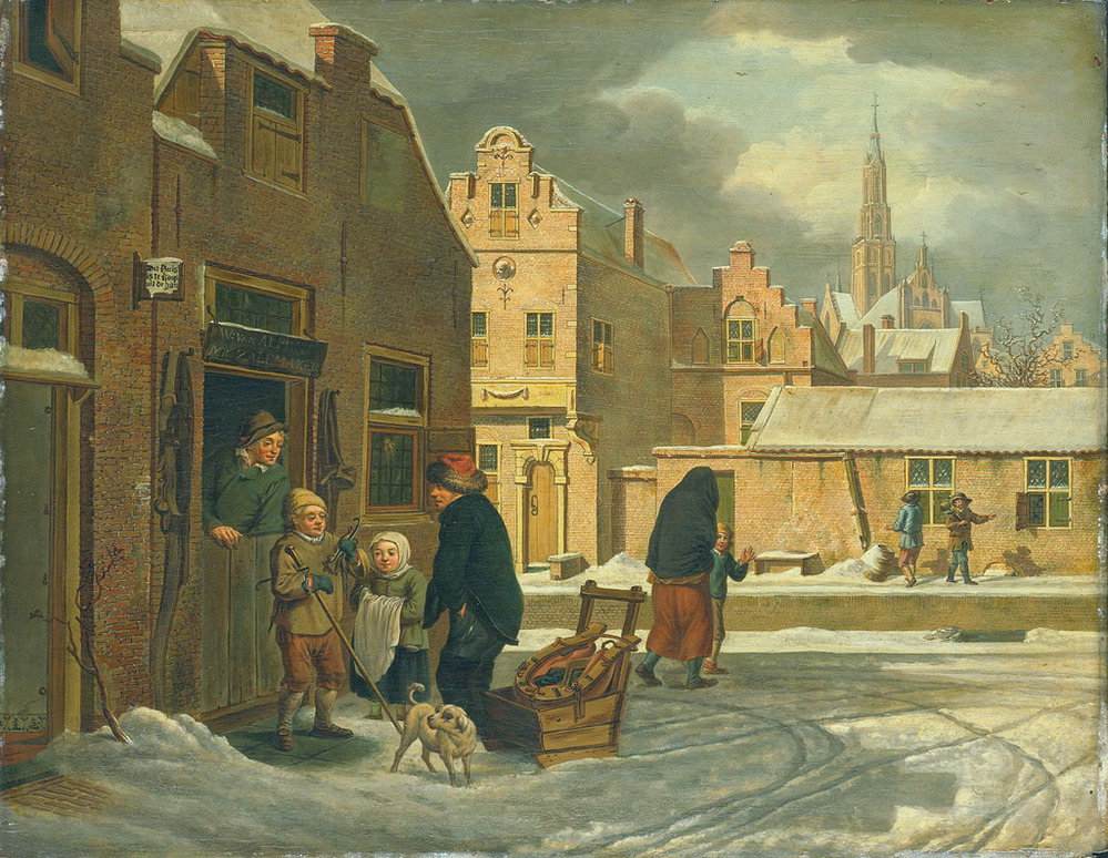 Stadsgezicht in de winter. Een man met een slede en twee kinderen staan voor een huis. Over de onderdeur kijkt een man naar buiten. De jongen heeft schaatsen in de linkerhand, een stok in de rechterhand. Hierbij ook een hond. Rechts lopen verschillende personen over de met sneeuw bedekte straten