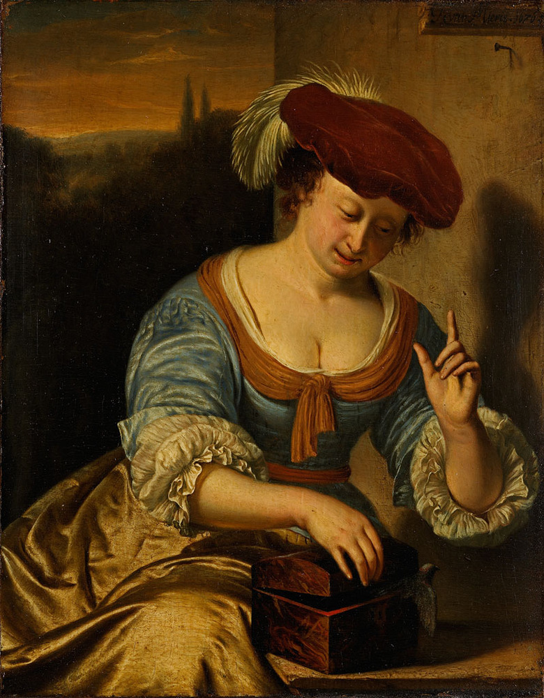 Een jonge vrouw zittend buiten op een bankje probeert te voorkomen dat een vogel uit een doosje ontsnapt. Zij houdt haar linkerhand waarschuwend op, op het hoofd een baret met een pluim
