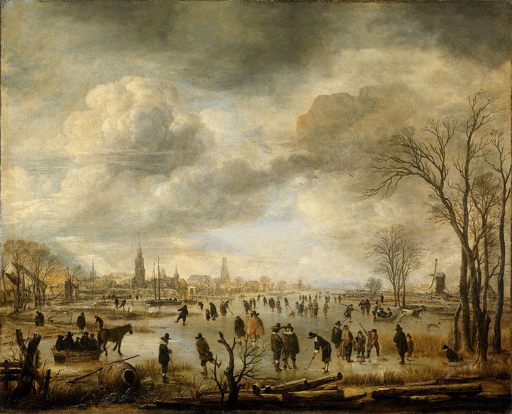 Riviergezicht bij winter. Op het ijs van een breed water buiten een stad vermaken mensen zich met kolfspelen, schaatsen en rijden in de arrenslede. Op de voorgrond een eendenkooi, rechts in de verte een molen, links de torens van de stad
