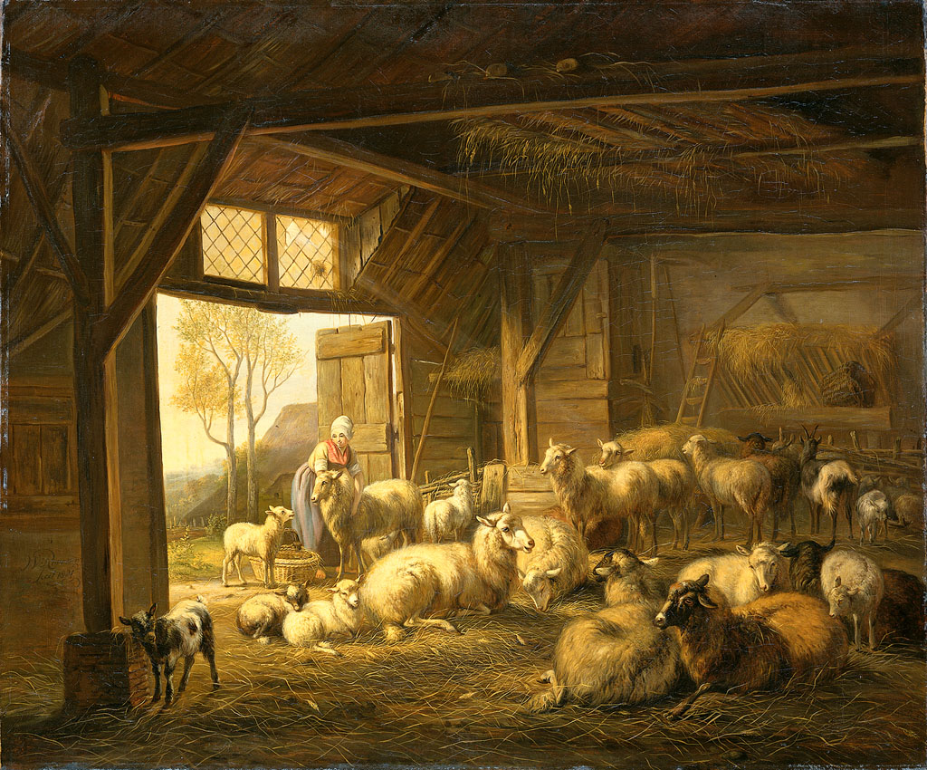 ...; veiling, Dirk Joosting (1763-1836), Amsterdam (J. de Vries et al.), 27 febr. 1837, nr. 136 ('Een zeer ruime Schapenstal van binnen, met openstaande deuren. Aan den ingang ziet men eene vrouw streelende een schaap; bij haar staat naast een gevlochten mandje, een jong lam. Verder ontwaard men, door den geheelen stal een groot aantal staande en liggende schapen, geiten en bokken; benevens eenig eigenaardig bijwerk.'), fl 465, aan de kunsthandelaar Albertus Brondgeest voor Adriaan van der Hoop [Lijst, p. 19, nr. 163; expl. RMA, RKD]; nagelaten aan de Stad Amsterdam, 1854 [Taxatie, p. 9, nr. 163, fl 60]; Museum Van der Hoop, 1854-1885; in bruikleen aan het Rijksmuseum, 1885.