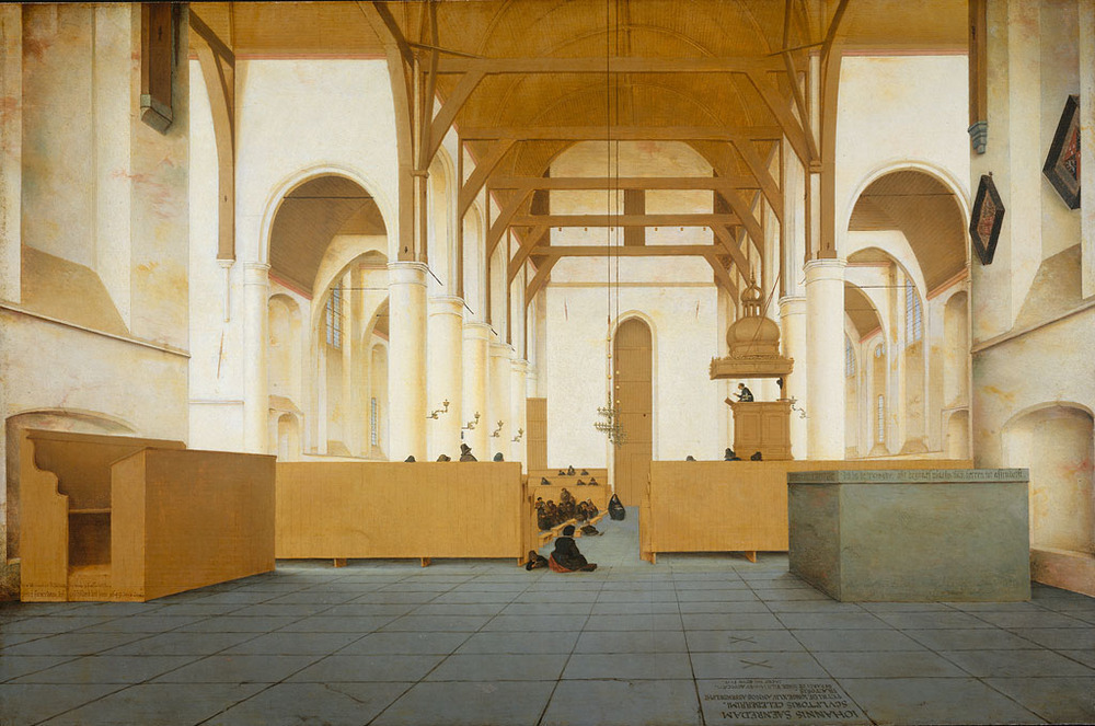 Interieur van de Sint Odulphuskerk te Assendelft, gezien vanuit het koor naar het westen, tijdens een kerkdienst. Rechts de predikant in de preekstoel. Rechtsop de voorgrond in de vloer de grafsteen van Jan Saenredam, de vader van de schilder