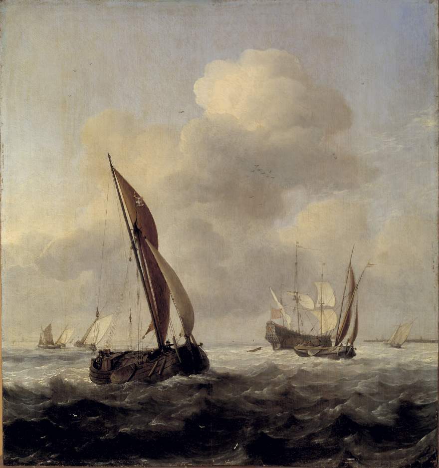 "Eenige zeilende marktschepen, verderop een oorlogsschip" (cat. Rijksmuseum). Hofstede de Groot duidt de kleinere schepen, met name het zeilschip links op de voorgrond als "vissersschepen" aan. Willis rekent het schilderij tot de zwakke, late - in de jaren 1690 ontstane - werken van de meester, m.i. per abuis of ten onrechte. Zoege van Manteuffel beschrijft de door de wind veroorzaakte beweging die is weergegeven en besluit: "Dieser leichten Unruhe des Ganzen entsprechen die Kompositionslinien". ( Albert Blankert)